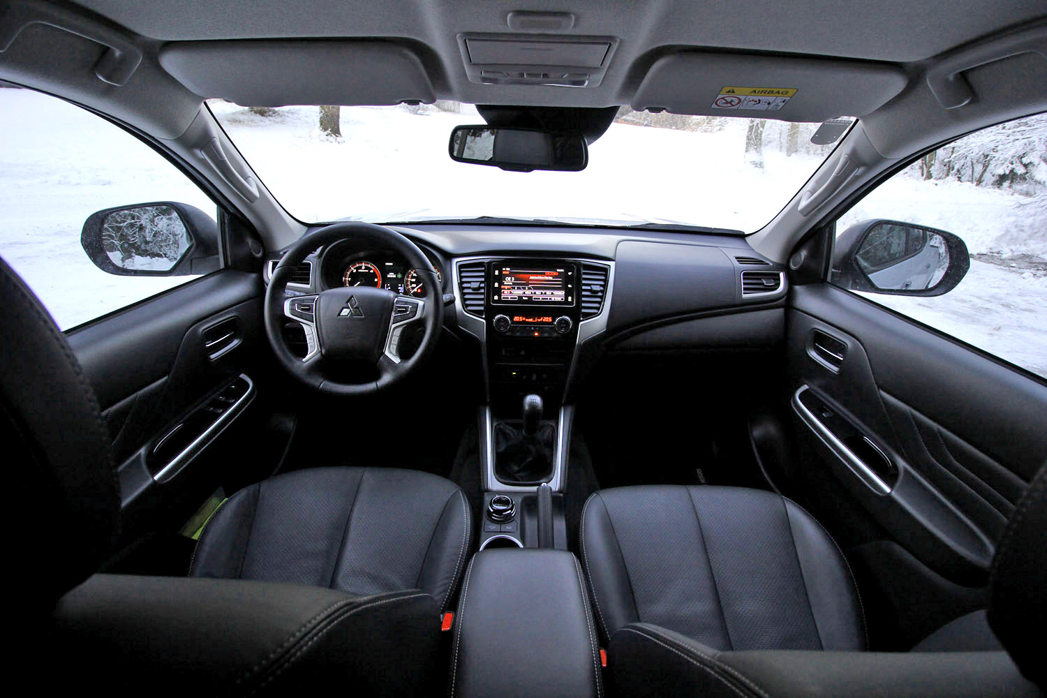 Beim Schwung hinter das Lenkrad des L200 erkannte ich schnell, dass es sich trotz der luxuriöseren Ausstattungslinie „Diamond“ um ein echtes Arbeitstier handelt. Davon zeugen beispielsweise der lange Schalthebel und diverses Hartplastik an den Türen und dem Armaturenbrett. Angesichts der Einsatzgebiete des japanischen Pickups finde ich das aber überhaupt nicht schlimm – übertriebener Luxus wäre hier sowieso fehl am Platz. Denn welcher Arbeiter möchte sich auch Sorgen um mögliche Verschmutzung des Innenraums machen müssen? Ein bisschen Luxus darf es dann aber doch sein, wie die mit Kunstleder bezogenen Teile der Türverkleidung und der Mittelkonsole beweisen. Zudem gibt es Keyless Go, eine Sitzheizung, eine Lenkradheizung, Ledersitze und einige nützliche Assistenzsysteme wie den Spurhalte- und Toten-Winkel-Assistenten.